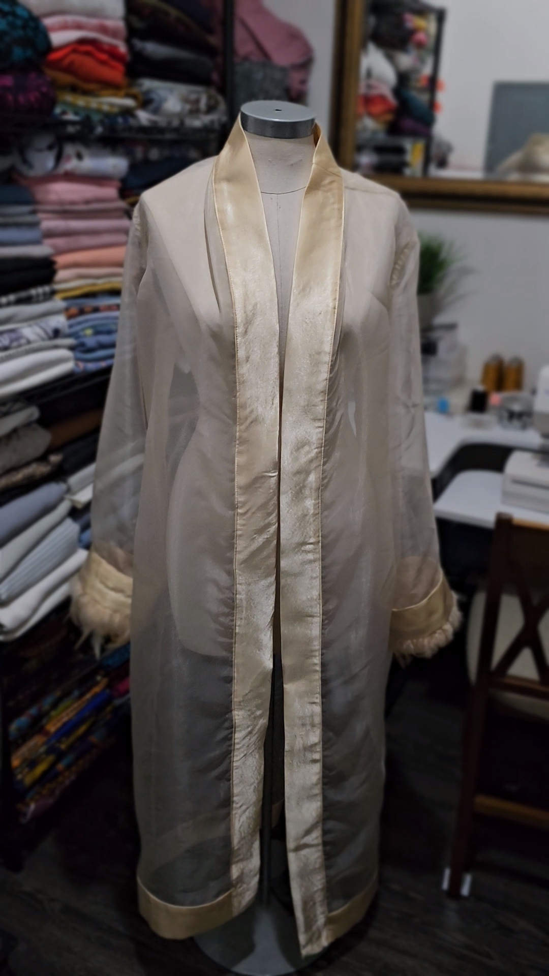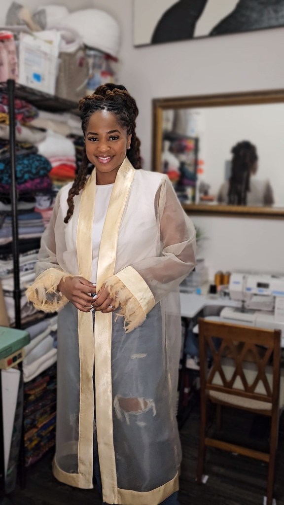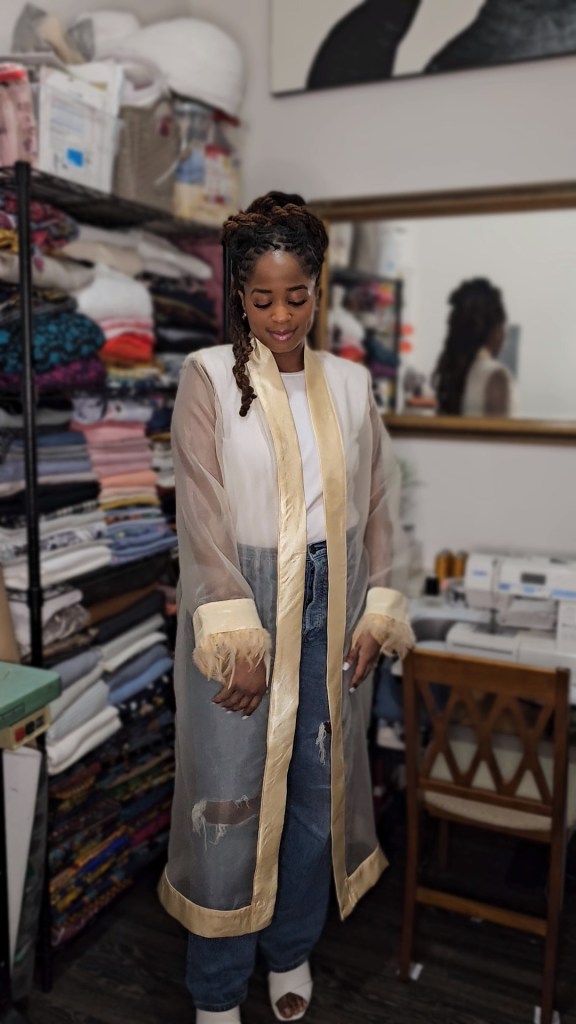 I thank God for that focus to finish it because this duster came out more beautiful than I imagined! Since I was using mesh, I did french seams all throughout the garment to ensure the inside looked just as good as the outside, since the material shows everything. I would have given the garment my folded clothing label, but again, it’s mesh and I personally would not like the look of a label sticking out against the mesh. I will eventually get the labels that are not folded to prevent this dilemma when making certain garments like this.